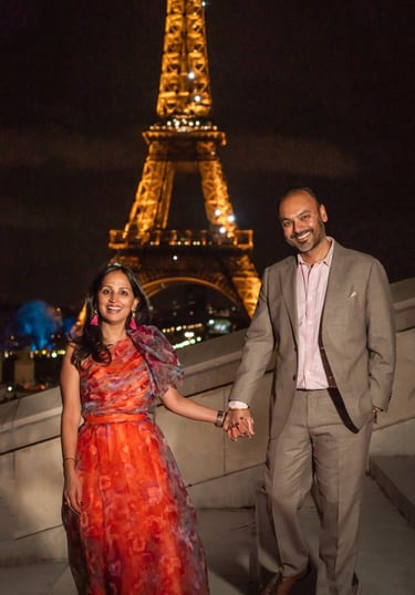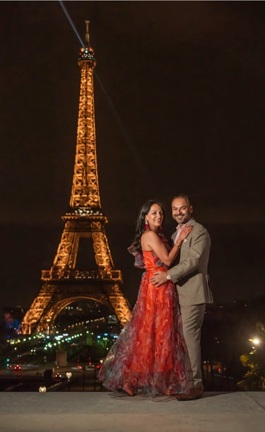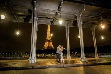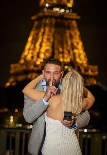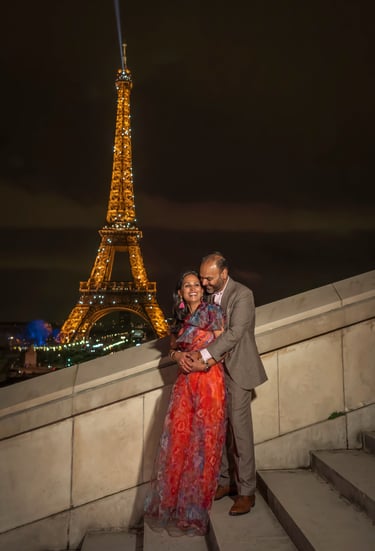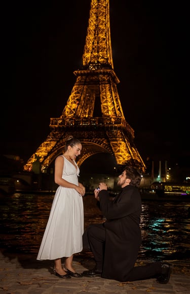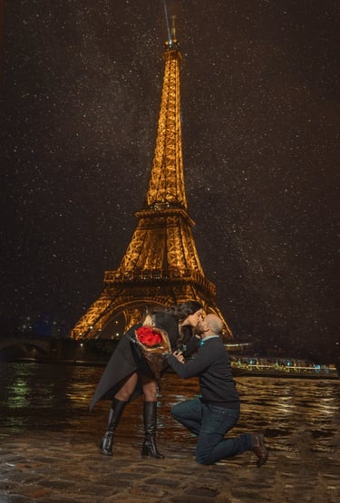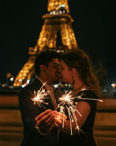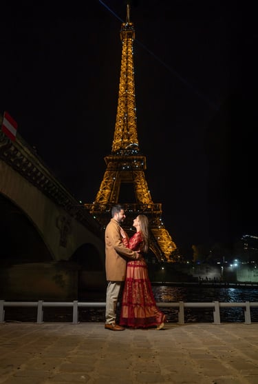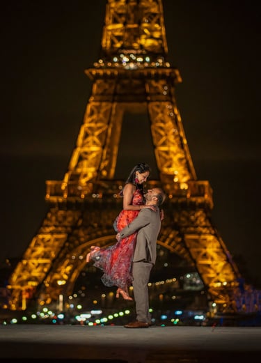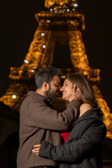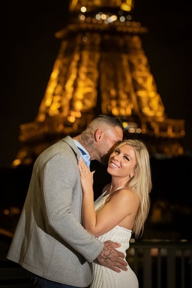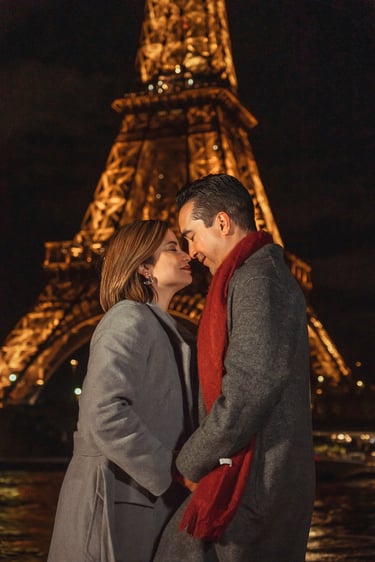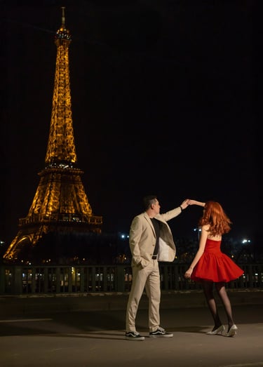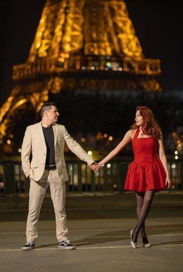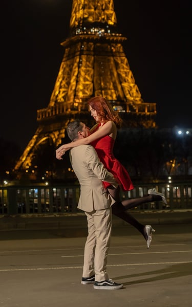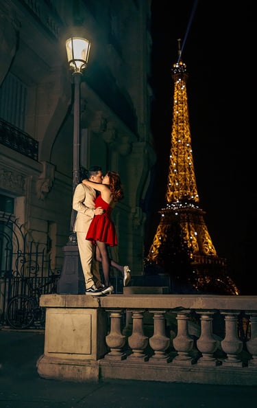 A night photoshoot in Paris offers a unique and magical touch, especially with the iconic Eiffel Tower as your backdrop. Its lights turn on automatically at dusk thanks to sensors, creating an unforgettable atmosphere. During winter, this happens from 5 PM onwards, while in summer, it can be as late as 10 PM.
